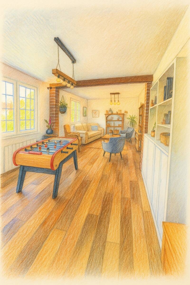 Repenser l'espace, optimiser la lumière : mon approche sur mesure. Après avoir relocalisé la cuisine, j'ai libéré le potentiel de l'espace de vie. Le retrait d'un mur porteur, remplacé par une poutre de soutien apparente, a permis de créer un salon spacieux et lumineux.