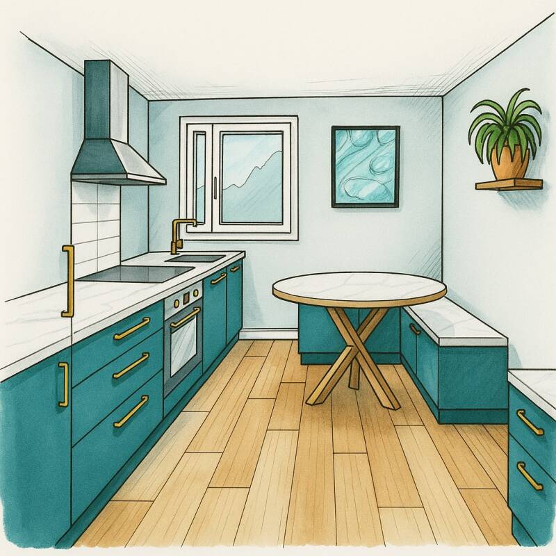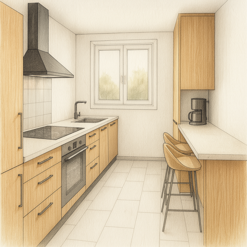 Face à une cuisine exiguë et mal positionnée, mon expertise a permis de repenser l'espace de vie.
