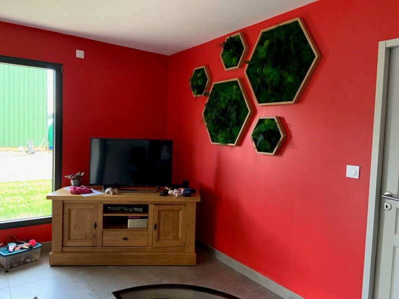 “Ici les clients adoraient leur mur rouge, leur proposer une décoration murale originale avec cette composition de cadres végétaux, plantes stabilisés,